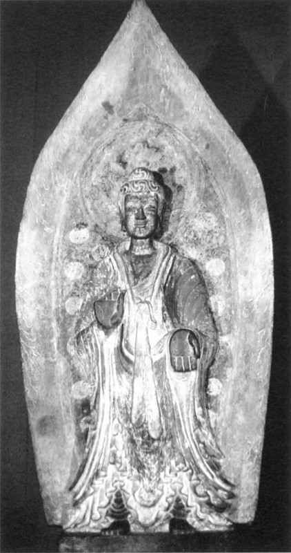 北魏彌勒佛石雕,定年516,著色、鍍金石灰?guī)r,現(xiàn)藏賓大博物館。圖片來(lái)源:Stanley K. Abe, “From Stone to Sculpture”, p.9.