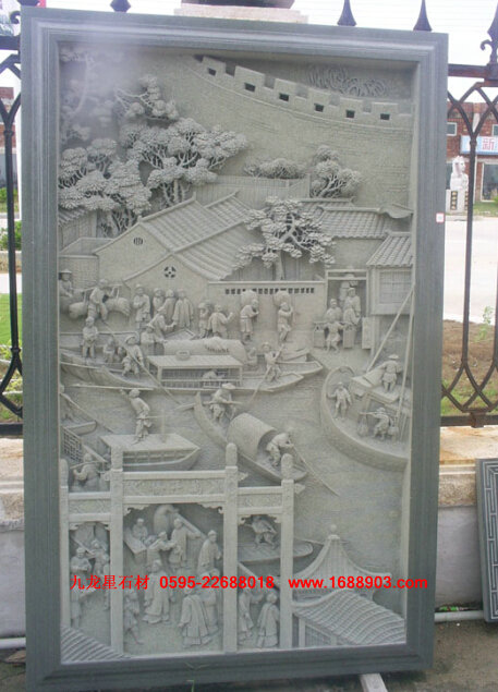 3、 沉雕。又稱"線雕",即采用"水磨沉花"雕法的藝術(shù)品。此類雕法吸收中國畫與意、重疊、線條造型散點透視等傳統(tǒng)筆法,石料經(jīng)平面加工拋光后,描摹圖案文字,然后依圖刻上線條,以線條粗細(xì)深淺程度,利用陰影體現(xiàn)立體感。此類產(chǎn)品多數(shù)用于建筑物的外壁表面裝飾,有較強的藝術(shù)性。