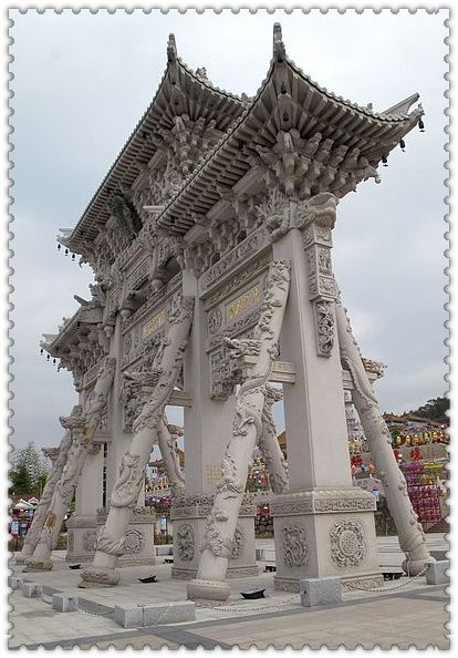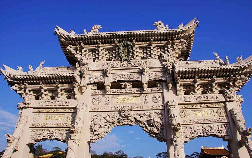 整座山門造型獨特,兩側護衛(wèi)山門的八根特殊龍柱,又稱“福賜八大龍金剛”,與山門形成穩(wěn)固的三角形,這在全國的石質(zhì)山門中絕無僅有。支撐山門的其他柱子則采用了多重疊加方式,先垂直后倒掛,遍布整座山門有100多條龍,象征著富貴和吉祥。據(jù)報載山門的修建請來了近60名一流的福建惠安石雕師傅,前后耗時3年,耗資1000萬元左右。