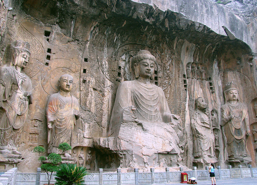 距市區(qū)13公里的龍門是洛陽南面的天然門戶,這里兩岸香山、龍門山對立,伊水中流,遠望就象天然的門闕一樣。因此自春秋戰(zhàn)國以來,這里就獲得了一個形象化的稱謂“伊闕”。隋煬帝都洛陽,因?qū)m城城門產(chǎn)正對伊闕,古代帝王又以真龍?zhí)熳幼跃?因此得名“龍門”,“龍門”之名即延用至今。舉世聞名的龍門石窟就雕刻在伊河兩岸的山崖上,南北長約1公里。從北魏孝文帝遷都洛陽時開始營造,經(jīng)過東魏、西魏、北齊、隋、唐、延至北宋,累計大規(guī)模開鑿約四百余年,現(xiàn)存窟龕2345個,碑刻題記2800余塊,佛塔70余座,造像近11萬尊。其窟龕、造像和題記數(shù)量之多,居中國石窟之冠,與敦煌莫高窟、大同云岡石窟并稱為中國三大佛教藝術(shù)寶庫。中華人民共和國國務(wù)院于1961年確定龍門石窟為全國第一批重點文物保護單位。2000年11月,聯(lián)合國教科文組織第24屆世界遺產(chǎn)委員通過列入《世界遺產(chǎn)名錄》。