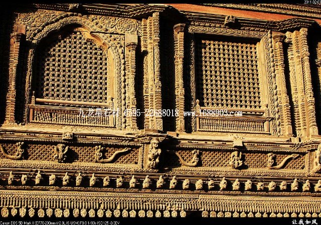 傳統(tǒng)的尼泊爾建筑,都使用雕刻木件,王宮和廟宇建筑自不必說,就是普通民居也是如此。使用雕刻木件處,主要是一些外露部分,如門、窗、廊柱、欄桿、屋頂及廊頂?shù)膿沃取?梢哉f,凡是外露的部分,有木件就有雕刻,而且都是人工雕刻。