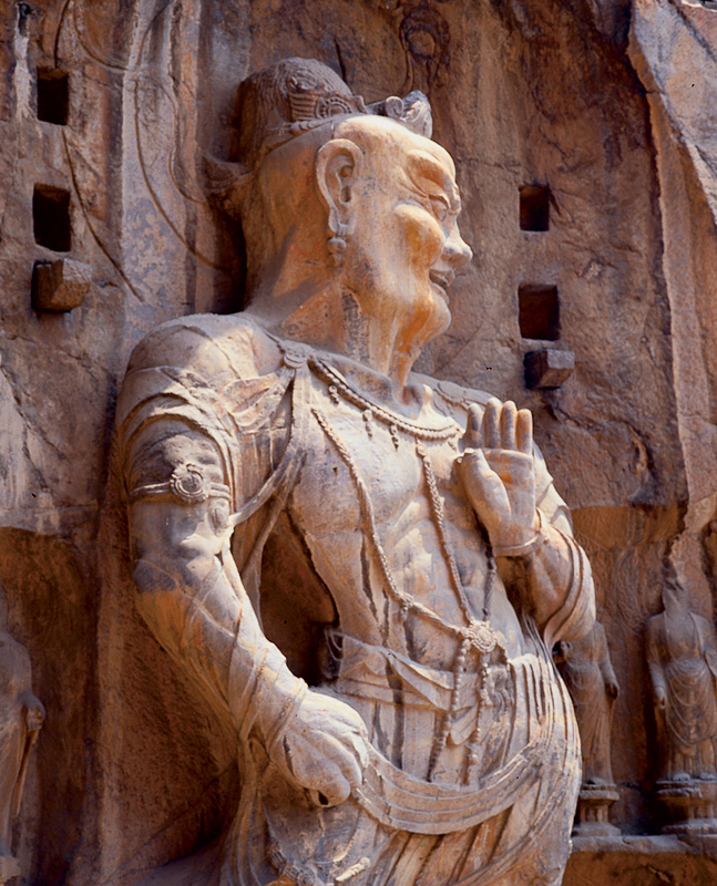傳神是中國藝術(shù)的最高審美要求。面部表情是最能表現(xiàn)人的思想感情的,佛的莊嚴(yán)、觀音的慈祥、憤怒的天王、騾悍的力士都要通過人的眼神、嘴唇的微妙變化傳達(dá)出來,當(dāng)然,眼睛離不開五官的諧和,神態(tài)也離不開身姿手勢的表征。除個體形象本身的傳神之外,傳神還表現(xiàn)在人物關(guān)系之間及巨幅造像的整體意境中。