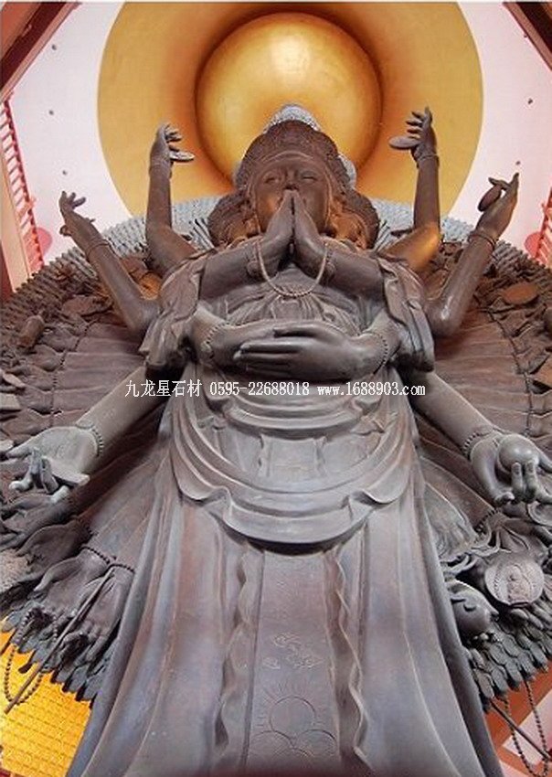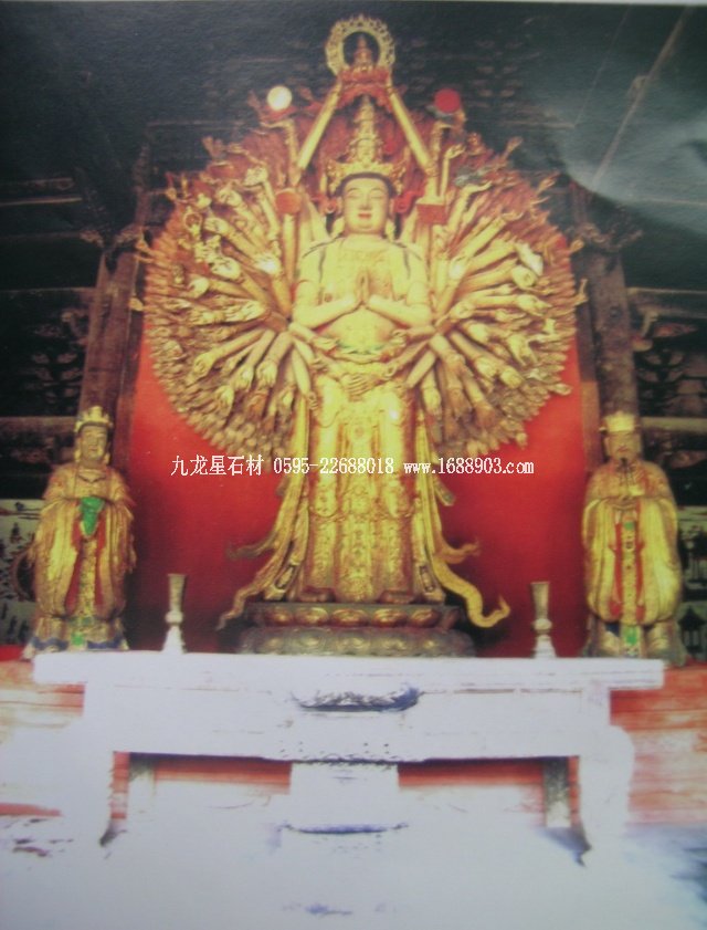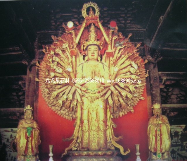 千手觀音是我國(guó)民間信仰的六大菩薩之一。千手觀音是阿彌陀佛的左脅侍,與阿彌陀佛、大勢(shì)至菩薩(阿彌陀佛的右脅侍)合稱為“西方三圣”。據(jù)佛教典籍記載,千手觀音菩薩的千手表示遍護(hù)眾生,千眼則表示遍觀世間。