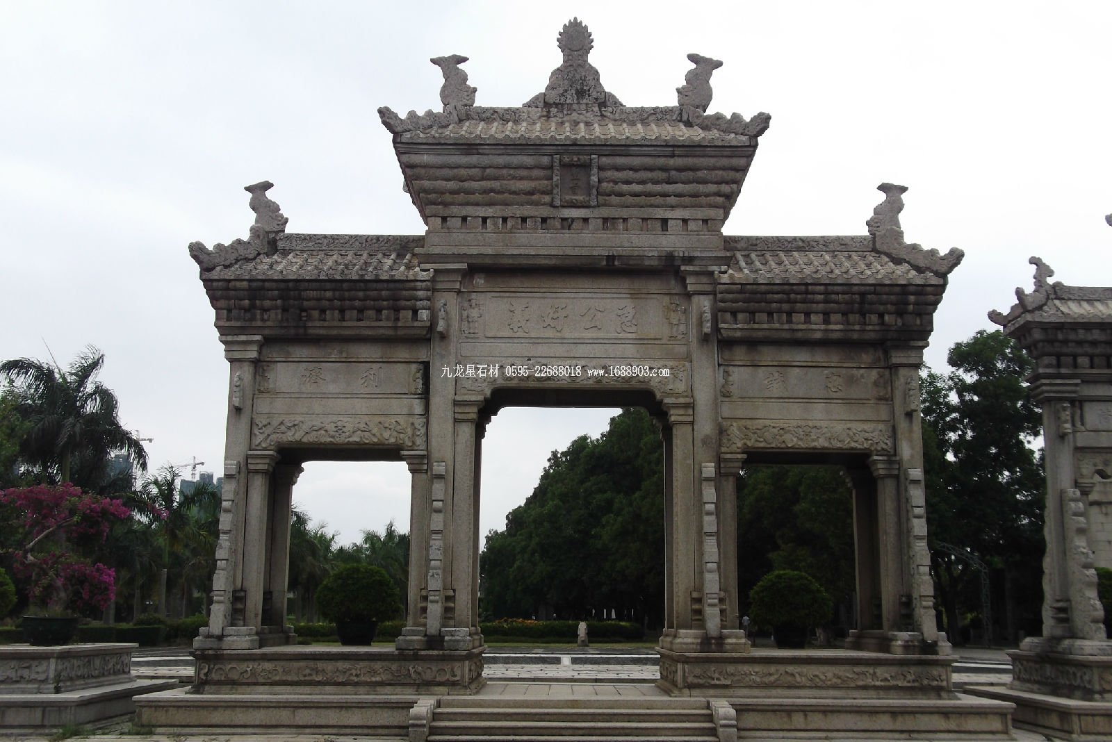 解放后因擴建馬路需要移走,一建公司的師傅們連夜施工,整拆整蓋,原樣又建在了城南的陶然亭公園,多好的東西啊!‘文革’中楞把它說成是“四舊”,下場是被砸爛、棄之。 寺院石雕山門 北京齊化門(今朝陽門)外神路街口的琉璃牌樓是北京同類牌樓中最大的,那是老東岳廟的遺物,現(xiàn)在掛上了“文物保護’的牌子。整個北京城保存下來最大的石牌樓得數(shù)明十三陵的牌樓,是六柱五間十一樓,建于嘉靖十九年,至今有小五百年的光景啦。這牌樓高十四米多,長有二十九米,梁朽、斗拱、屋頂都是仿木制結構的形制雕刻成的。梁朽上雕刻出旋子點金彩畫,從殘存的顏色還能隱約看出當年石坊上曾經有過美麗的彩繪。在石坊六根方柱石下是巨大的夾柱石(又叫袍柱石座),石上雕刻著巨龍、海獸、獅子、麒麟和云氣波濤,鬼斧神工的匠術令人贊嘆不已。 今天,古老的北京在保護和修葺古老牌樓的同時,一些新的牌樓也拔地而起:王府飯店前面的牌樓,琉璃廠文化街的牌樓,紫玉飯店的牌樓,地壇公園西門外的牌樓,還有老北京微縮景園的牌樓……得,聊這么會子啦,今兒個就先到這兒,您抽功夫迢彎,看看這些個牌樓那不也是件有意思的事嗎?興許到時咱們還能碰上,到那時我沏上壺好茶再跟您慢慢聊吧!.