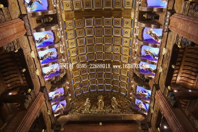 梵宮的內(nèi)部,舉目可見東陽木雕、敦煌壁畫、揚(yáng)州漆器、景泰藍(lán)、琉璃、溫州甌塑等等藝術(shù)珍品。能將如此眾多的中國非物質(zhì)文化遺產(chǎn)納入一座建筑的,目前似乎只有梵宮,也因此,有人稱它為“東方的盧浮宮”。由于梵宮顛覆了中式宗教建筑的傳統(tǒng)理念,舍棄了中國傳統(tǒng)佛教建筑慣用的木頭、琉璃瓦等材料,而用鋼筋混凝土建造,因而為設(shè)計(jì)施工帶來了很大難度。