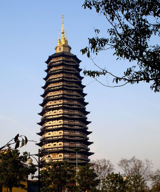 天寧寶塔乃中華第一佛塔(全球最高佛塔)位于江蘇省常州市天寧寺內(nèi)。天寧寶塔始建于2002年4月,于2007年4月30日開光。總建面積2.7萬(wàn)平方米,塔高13層153.79米,為國(guó)內(nèi)4000多座寶塔之最;從底層地宮到頂層鐘樓,整座寶塔以佛教文化為主線,以東陽(yáng)木雕、揚(yáng)州漆器、常州亂針繡、惠安石雕等手工藝術(shù)為表現(xiàn)手法,巧妙地詮釋了大乘佛教的諸多教義。佛塔的建成,與北方云崗大佛、中原龍門大佛、西方樂(lè)山大佛、東方靈山大佛、南方香港天壇大佛遙相呼應(yīng),成為五方五佛的佛心。