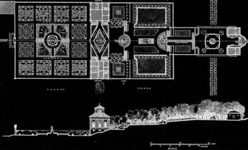 在一層臺地末端中軸線上,設計者特意設計了一個一個觀景平臺,用于觀賞斜坡花壇。這樣的觀賞點就像把整個花壇豎起來觀賞一樣。