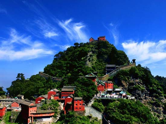 武當(dāng)山又名“太和山”,位于中國中部湖北省丹江口市的西南部。相傳為道教玄武大帝(北方神)修仙得道飛升之勝地, 歷代道教名流曾在此修煉。據(jù)記載, 唐太宗貞觀年間即在靈應(yīng)峰創(chuàng)建五龍祠。宋、元以來, 代有開拓?cái)U(kuò)建。明成祖于永樂十年(1412)曾動(dòng)用軍夫30多萬人在此大興土木?,F(xiàn)存的36處宮觀大多是明代所建, 是中國現(xiàn)存最完整、規(guī)模最大、等級(jí)最高的道教古建筑群。宮觀內(nèi)保存的各類神像、法器、經(jīng)籍等都有較高的文物和藝術(shù)價(jià)值。明代(公元1368~1644年)時(shí),武當(dāng)山被皇帝敕封為“大岳”、“玄岳”,地位在“五岳”諸山之上。武當(dāng)主峰天柱峰,海拔1612米,周圍又有“七十二峰”、“三十六巖”、“二十四澗”等勝景環(huán)繞,風(fēng)光旖旎,氣勢宏偉,被世人贊為“萬山來朝”。