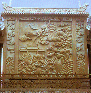 莊園大量的石雕,還是砂石作品。其石材多取于附近山中,質(zhì)地有白、綠、紅、青多種,主要用于橋、廳、臺、廊的護(hù)欄和柱體,半亭花墻、影壁和牌坊,刀法較青石作品粗獷、雄渾,畫面疏朗典雅、疏密得當(dāng)、虛實(shí)和諧、古樸堅(jiān)實(shí),顯得特別有氣魄。杏壇、街心牌坊、祠堂獻(xiàn)廳圍欄、養(yǎng)和堂階欄、半亭、三星影壁和莊園西門魚躍龍門巨幅石額,就是砂石雕刻的代表作。