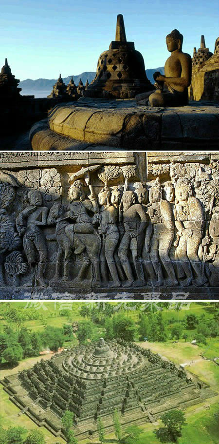 據(jù)說,婆羅浮屠是一座9世紀(jì)時(shí)期位于印度尼西亞中爪哇省馬格朗地的大乘佛教佛塔。實(shí)際上,此佛塔的實(shí)際存在時(shí)間比那個(gè)時(shí)間還要古老很多。這座塔共九層,上面三層是圓形,下面是六層方形,裝飾有2672塊浮雕和504尊羅摩居民的雕像。每面墻都上都有一個(gè)有關(guān)大佛出身的故事以及佛手的故事。主圓塔位于最頂層中心,其四周的里面坐著72個(gè)羅摩居民雕像的穿孔佛塔。