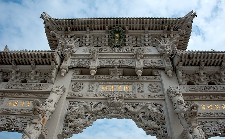 百余名惠安石雕師傅歷時兩年雕刻完工。梅山寺石質(zhì)山門總高度23米,寬23.6米,全部由花崗巖石雕刻而成,四柱三門結(jié)構(gòu),大型山門總石方用量達680多立方米,居我國現(xiàn)有石質(zhì)山門中石方用量之首。山門雕刻工藝高超,其復雜程度和難度全國罕見。斗拱采用的是整塊石材,