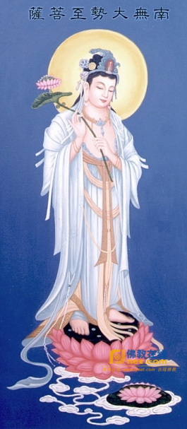 大勢(shì)至,音譯摩訶娑太摩缽缽羅缽跢。意譯作“得大勢(shì)”、“大精進(jìn)”。略稱勢(shì)志菩薩、勢(shì)至菩薩。此菩薩以智慧光普照一切,令眾生離三涂,得無(wú)上力;又彼行時(shí),十方世界一切地皆震動(dòng),故稱大勢(shì)至。與觀世音菩薩同為西方極樂世界阿彌陀佛之脅侍,世稱西方三圣。首楞嚴(yán)經(jīng)卷五念佛圓通章謂,大勢(shì)至菩薩于因地時(shí),以念佛心入無(wú)生忍,故今攝此娑婆世界之念佛眾生,歸入凈土。又依悲華經(jīng)卷三載,當(dāng)阿彌陀佛入滅后,由觀世音菩薩補(bǔ)其位;觀世音入滅后,則由大勢(shì)至補(bǔ)處成佛,掌握化權(quán),號(hào)善住珍寶山王如來(lái)。
