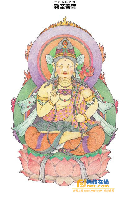 關(guān)于其形像,據(jù)觀無(wú)量壽經(jīng)載,其天冠中有五百寶花,一一寶花又有五百寶臺(tái),每一寶臺(tái)皆現(xiàn)十方諸佛之凈妙國(guó)土相;頂上之肉髻如缽頭摩花,肉髻中安置一寶瓶;其余身相則與觀世音菩薩大同小異。又據(jù)阿唎多羅陀羅尼阿嚕力品載,二菩薩俱呈純金色白焰光,右手執(zhí)白拂,左手執(zhí)蓮花,大勢(shì)至之身形較觀世音小。于密教現(xiàn)圖胎藏界曼荼羅中,位于觀音院內(nèi)列上方第二位,全身肉色,左手持開合蓮花,右手屈中間三指,置于胸前,坐于赤蓮花上。密號(hào)持輪金剛,三昧耶形為未開敷之蓮花。(大阿彌陀經(jīng)卷上、悲華經(jīng)卷二、法華經(jīng)玄贊卷二、陀羅尼雜集卷一、大日經(jīng)疏卷十三)