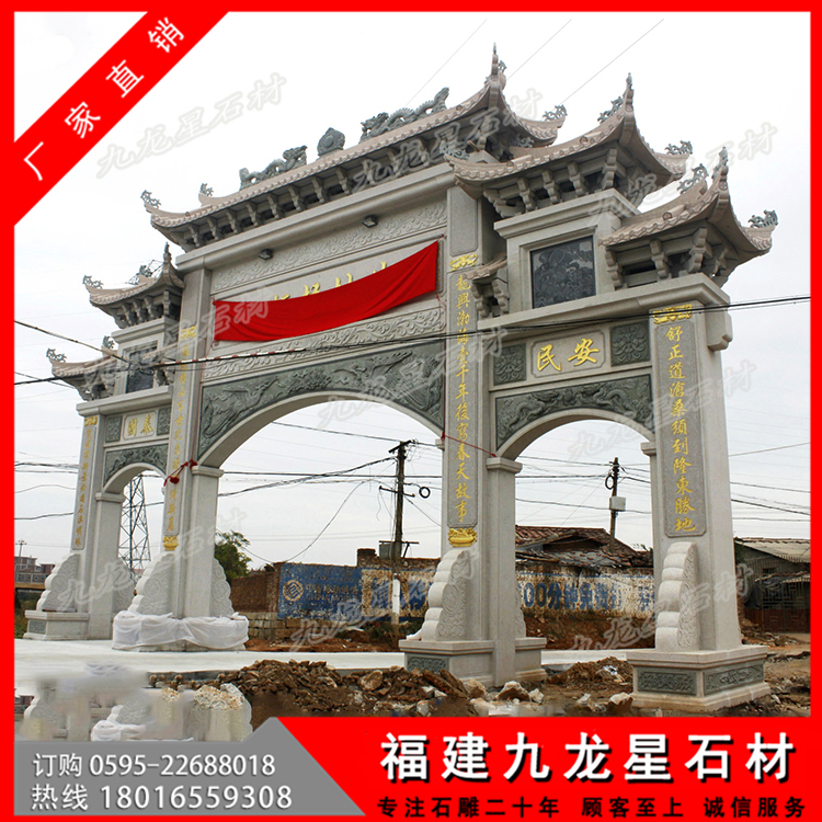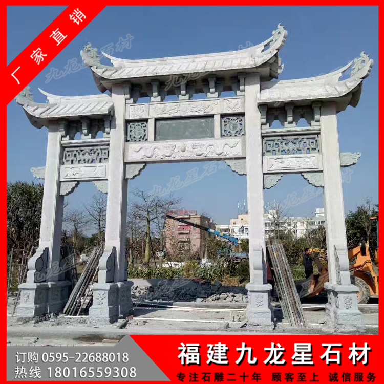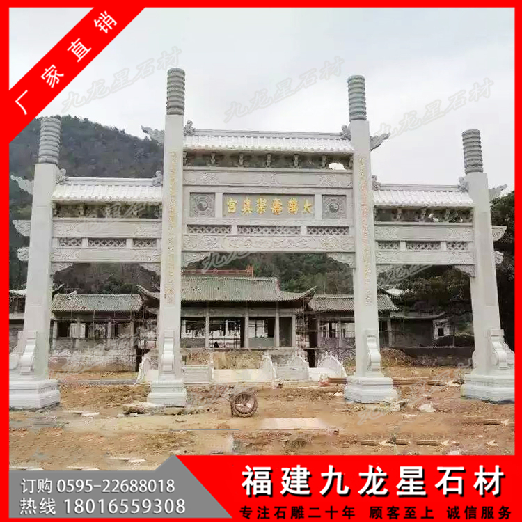 第二:牌坊大小,大型牌坊也有大小之分,筆者見過最大的牌坊高達(dá)6米,左右寬12米,深3米,整座牌坊完全采用立柱搭建,造型別致,精妙絕倫,這樣的大型牌坊價格是非常高的,當(dāng)時聽聞,需要幾千萬制作而成。但是普通的三門牌坊也可以稱之為大型牌坊,價格不過幾萬到十幾萬也非常多。主要是越大的作品,需要加工的工藝和使用的石料都會增加,并且后續(xù)的運輸,安裝也會非常的繁瑣導(dǎo)致的。