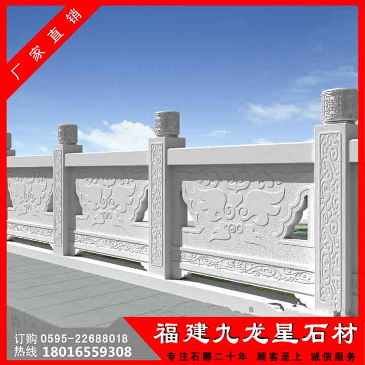 石雕欄桿是橋梁或建筑上的安全防護(hù)設(shè)施,欄桿不但要求堅(jiān)固,起到一定的防護(hù)作用,而其還要注意美觀,起到美化建筑的作用。石雕欄桿優(yōu)點(diǎn)很多,最重要的是容易清洗,看起來(lái)高端大氣,質(zhì)量也好,并且給人非常充實(shí)的感覺(jué)。而實(shí)用性上,石材的欄桿可以使用更長(zhǎng)的年限,且結(jié)實(shí)牢固,安全性上面也是有保障的。石雕欄桿有著美觀、時(shí)尚、環(huán)保、抗老化、不變形的性能優(yōu)點(diǎn),可廣泛用于市政、水利、公園、橋梁欄桿等護(hù)欄工程。