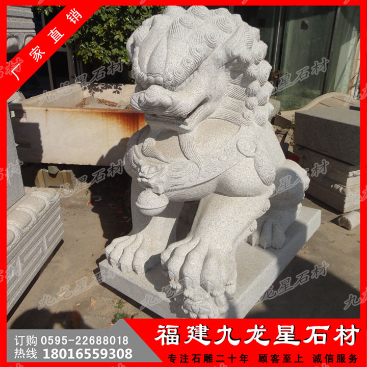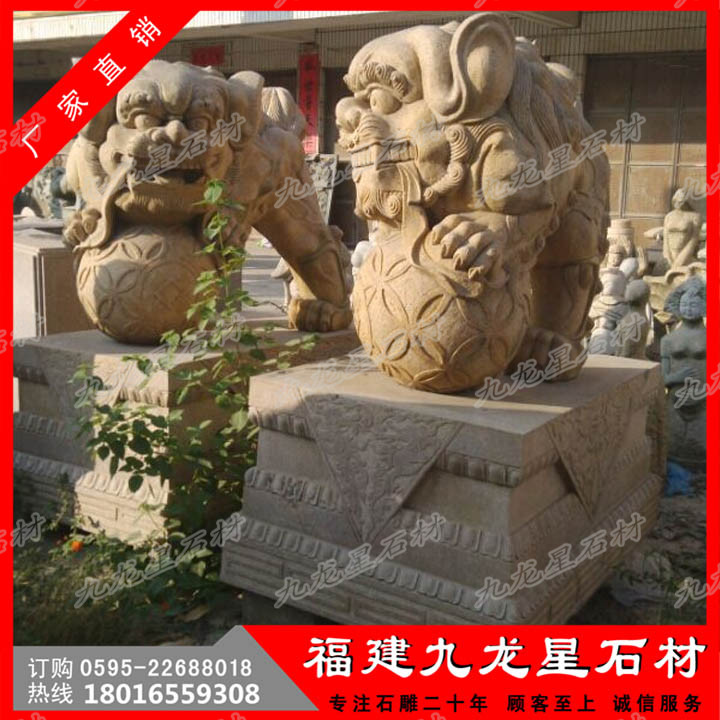 石雕動(dòng)物獅子的腦門(mén)寬闊隆起,天庭飽滿(mǎn),下頜裂開(kāi),地閣方圓.眼窩深,眼球鼓,鼻根深陷,張嘴似欲吞欲笑,多呈憨態(tài).毛發(fā)呈卷曲紐狀,自然地附著頸項(xiàng)部,更顯得威而不怒,猛而不殘.石獅有雌雄兩種:雄獅口含圓珠,耳呈葉狀,兩邊超過(guò)卷毛高度,毛發(fā)卷曲很有規(guī)律,布滿(mǎn)了耳、頸部。有時(shí)腳蹬繡球,表示其性貪玩耍.而雌獅身上多背小石獅子,或足下踩小石獅,表示一種"母愛(ài)",很有情趣,一般情況下,門(mén)左置雄獅,門(mén)右置雌獅。